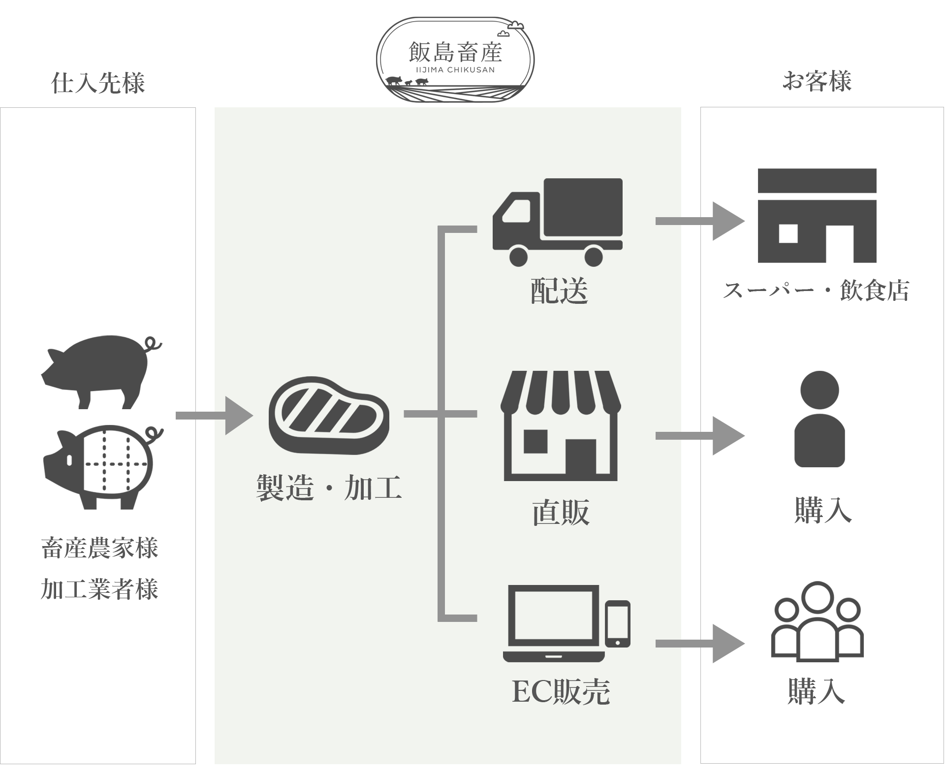 「製造」「直販」「配送」「事務/DX」の4部門が一丸となり飯島畜産の事業を支えています。