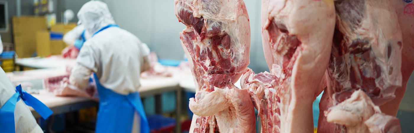 スライサーと呼ばれる専用機械を使って、ハムや焼肉用の切り身などを均一な厚さでスライスしていきます。